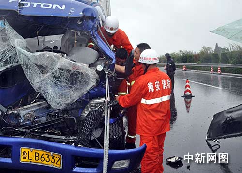 上午8時11分,海安消防部門接到縣110指令,稱沿海高速海安往如皋方向兩車發(fā)生追尾事故,一人被困車內(nèi),情況十分緊急。中隊迅速出動警力起到現(xiàn)場。只見現(xiàn)場滿地都是貨車上散落的貨物,一輛山東牌照的貨車卡在蒙古牌照大貨車的尾部,駕駛座面目全非。山東牌照的貨車駕駛員更是卡在駕駛室內(nèi),傷勢較嚴重,不得動彈,情況危急。