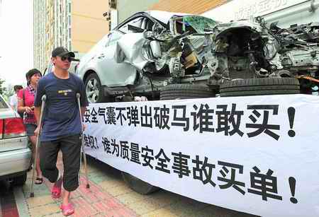 昨日上午,很多途經(jīng)市中心的市民都目睹了一支稀奇的隊伍:尼桑開道,拖車尾隨。拖車上躺著一輛銀色寶馬,車頭右側(cè)受損嚴(yán)重,右前車門扭曲,兩個前胎都脫離車體。拖車的三面拉著白底黑字的橫幅,上書“寶馬自然爆胎安全氣囊不彈出 破馬誰敢買!誰為消費者維權(quán)!誰為質(zhì)量安全事故買單!”等字樣。