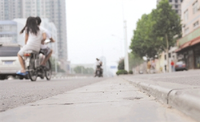 隨后,記者再次趕往事故地點,發(fā)現(xiàn)“兇手”是快車道和人行道之間的銜接部分。乍一看和其他剛修的路段一樣,并不能看出這條路有啥異樣,俯身細看,才找到“癥結(jié)”:快車道和人行道長約20米的交界處,臺階高出快車道約2厘米。
