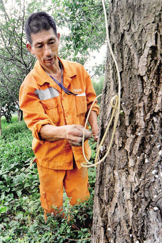可是,究竟是誰這么缺德干壞事,東方市政公司的人也一籌莫展。根據(jù)對樹木傷勢的判斷,他估計灌進樹木里面的藥水是硫酸或者草甘寧。
