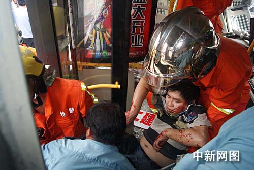 時間就是生命,救援刻不容緩,經(jīng)過現(xiàn)場勘查后,指揮員吳彬立即下達作戰(zhàn)命令展開營救。警戒小組負責現(xiàn)場警戒,同時維護好現(xiàn)場秩序,以便營救工作迅速展開;救援小組一方面負責協(xié)助現(xiàn)場民警、醫(yī)生對受傷乘客進行救助轉移,另一方面負責對那名傷勢較重的乘客實施緊急破拆救人。