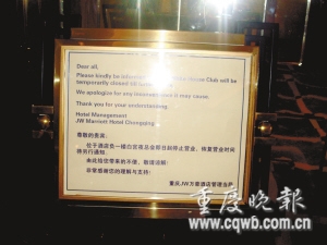 昨日,記者來到位于較場口的萬豪白宮會所。會所大門緊閉,一個告示牌放在門口,上面寫著:“尊敬的貴賓,白宮會所已停止?fàn)I業(yè),恢復(fù)營業(yè)時間另行通知!甭淇钍侵貞cJW萬豪酒店管理當(dāng)局。