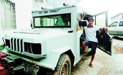 “我是今年4月份開始造這輛車的!比ツ陾顐悅ベI來一輛二手越野車開,車子老是出問題,他便有了自己造一輛車的大膽想法。他從網(wǎng)上下載“悍馬”圖片,一邊研究一邊創(chuàng)新。設計圖出來了,他拆卸了一輛進口三菱車的底盤,買來配件,自己搭造骨架、焊接外殼,他還特地跑到車輛修理廠“偷師學藝”,終于造出“悍馬”。