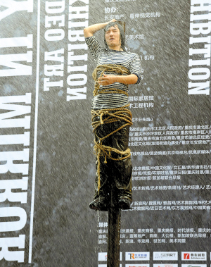 37攝氏度的高溫下,26歲的王軍被綁在近10米高的柱子上,先是被酷熱“折磨”了半小時,后又被環(huán)衛(wèi)車的水龍頭沖淋了半小時,耗費了8噸自來水,總共耗時兩小時。這個名為《守望》的行為藝術(shù)作品昨天下午在黃桷坪102藝術(shù)區(qū)雷倒了不少人!