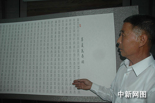 中新網(wǎng)唐山9月8日電 (白云水 雷向東)8日,河北省遵化市退休干部劉宗易80米長、由10000個異體壽字組成的“華夏萬壽圖”正式完成。劉宗易稱,此舉為慶祝新中國成立60周年獻禮,寄托自己對祖國的一片祝福之情。