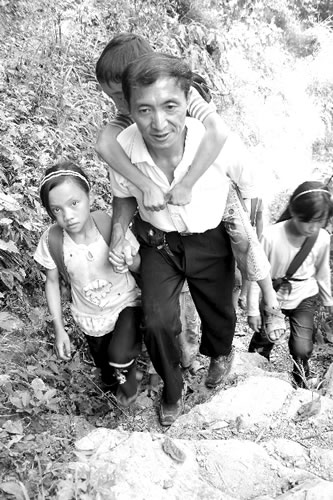 這是王正龍27年來唯一打的退堂鼓,仙峰苗族鄉(xiāng)中心校校長陳于強(qiáng)稱,對于王老師的“正常想法”,他們左右為難。“我舍不得孩子們,但是我一個(gè)大男人靠工資吃不飽飯,我還要孝敬老人、養(yǎng)兒養(yǎng)女!”王正龍的話“刺痛”了陳于強(qiáng)。“你不代課了,一時(shí)沒人接替你,我們只好撤掉兩個(gè)年級,有條件的孩子只能下山來讀。”陳于強(qiáng)沉默了一陣后說。 “下山來讀?說得輕巧!蓖跽埣绷耍@樣肯定有70%的孩子會輟學(xué),“我繼續(xù)教吧!山區(qū)的孩子不能沒有老師!”長嘆一口氣,王正龍又爬山路返回村小。
