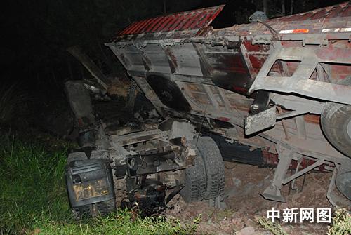 4時(shí)15分,消防隊(duì)員趕到事發(fā)路段,只見(jiàn)大掛車(chē)正翻倒在路旁,由于側(cè)翻時(shí)車(chē)體與地面產(chǎn)生摩擦非常大,掛車(chē)車(chē)頭嚴(yán)重變形,滿載的鋼筋及車(chē)體碎片散落一地,事故現(xiàn)場(chǎng)能清晰的看到一條磨擦印。此時(shí),副駕座上的一男子整個(gè)身體都已被甩出駕駛室外,但是該男子頭部卻被卡在右側(cè)車(chē)窗處,經(jīng)現(xiàn)場(chǎng)救護(hù)醫(yī)生判斷該名人員已沒(méi)有了生命體征,已經(jīng)死亡。