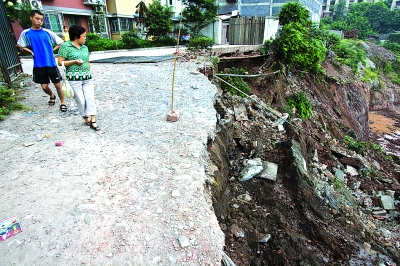 9月11日晚9:30,石小路64號附1號樓住戶邱國華聽到一聲巨響,抬眼一看,小區(qū)后方的邊坡及圍墻瞬間化為烏有,所幸沒有人員傷亡。昨日6時,記者到達(dá)事發(fā)現(xiàn)場,民警已將現(xiàn)場封鎖,記者看見38米長的邊坡已經(jīng)殘破不堪,邊坡的水泥地面已生出裂痕,坍塌面上也有幾道細(xì)長的裂縫蔓延在10米多高的殘面上,坍塌的泥土磚石小山般堆積在小區(qū)邊的施工工地,半扇小區(qū)鐵門倒在地面,一根黑色管道裸露著,居民告訴記者,這根管道是天然氣管。