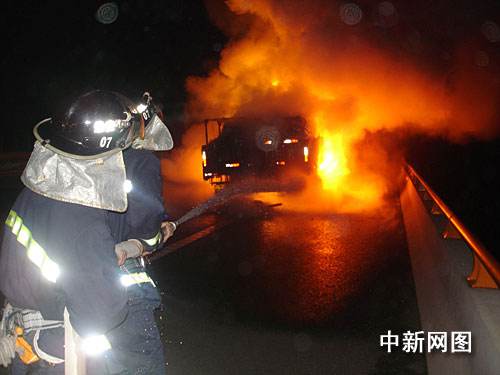 當(dāng)日凌晨,一輛由連云港開往廣州的大貨車在駛至寧連高速南京方向159公里處時,駕駛員無意中通過后視鏡發(fā)現(xiàn)貨車左后輪胎起火,于是趕緊將車?康铰愤叄杆偃〕鰷缁鹌鬟M行滅火并報警。但滅火器很快被用完,大火仍然猛烈燃燒,附近沒有任何水源,無奈之下,司機只得等待著消防官兵到來。
