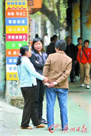 廣州目前有200多萬戶家庭,其中至少有20%的家庭要請住家保姆和鐘點工。有老人的家庭對保姆需求更大,而到去年底廣州市60歲以上的老人有108萬,并以每年4%的速度遞增。相比急速增長的需求,廣州家庭服務業(yè)現(xiàn)狀卻是“小、散、弱”。管理的缺失一直困擾著這個行業(yè)的健康發(fā)展,如何扭轉這一局面?