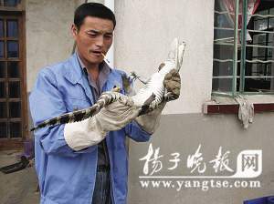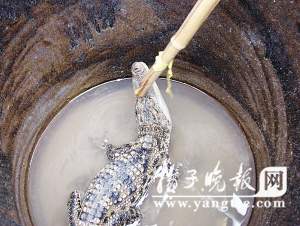 昨天上午,記者接到市民董先生的報(bào)料來(lái)到了江寧谷里孝義村111號(hào),周國(guó)喜正蹲在一個(gè)大缸前,旁邊還有幾位村民在指指點(diǎn)點(diǎn)。記者走近一看,只見一只長(zhǎng)約80厘米的小鱷魚正在缸底,頭部往上翹,尾部不停地甩動(dòng),看上去很緊張。盡管這條小鱷魚給周國(guó)喜帶來(lái)了不小的損失,可他沒有絲毫的恨意,反倒細(xì)心照顧起來(lái)!斑@個(gè)魚塘我一直在養(yǎng)魚,每年2月份和6月份都投放一次魚苗,總共1萬(wàn)多條,鳊魚、鯽魚都有!敝車(guó)喜說(shuō),可讓他奇怪的是,產(chǎn)量都不高。周國(guó)喜曾研究過(guò)多次,可沒有任何結(jié)果,這讓他百思不得其解?删驮诮衲8月份的時(shí)候,周國(guó)喜在清理魚塘?xí)r,突然發(fā)現(xiàn)一只小怪物伸出了頭,嘴巴長(zhǎng)又尖!熬褪撬耍耶(dāng)時(shí)確定魚塘產(chǎn)量不高就是因?yàn)檫@只小怪獸。”周國(guó)喜告訴記者,他自此開始盯著魚塘,可小怪獸很警惕,大都在魚塘底,很難發(fā)現(xiàn)。功夫不負(fù)有心人,通過(guò)近半個(gè)月的觀察,周國(guó)喜發(fā)現(xiàn)小怪獸喜歡上岸睡覺,不過(guò)是在對(duì)岸的水花生上面,很難捕捉。“尾巴很長(zhǎng),嘴很尖,身上顏色黃黑相間。”周國(guó)喜說(shuō)第一眼看到小怪獸就覺得像是鱷魚,不過(guò)他不敢確認(rèn),于是喊來(lái)了弟弟,結(jié)果弟弟覺得像是國(guó)家一級(jí)保護(hù)動(dòng)物揚(yáng)子鱷。