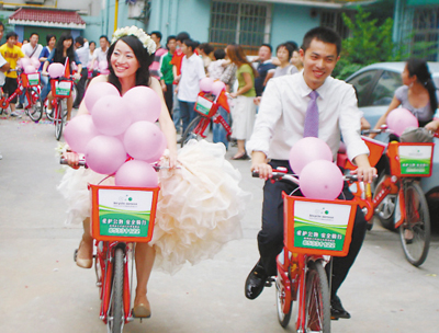 昨天,一支飛揚(yáng)著彩色氣球的公共自行車隊(duì),在西湖文化廣場集結(jié)。新郎麥田與新娘小A騎公共自行車步入婚姻殿堂。
