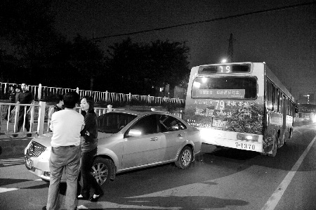 一輛79路公交車逆向倒車,車屁股撞上了正常行駛的別克車屁股,9月25日晚8點(diǎn)左右,這一奇特的撞車景觀出現(xiàn)在二環(huán)支路的立交橋附近。
