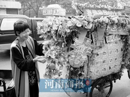昨日上午10時許,一輛披著鮮花,插著國旗的彩色三輪車出現(xiàn)在鄭州市經(jīng)八路上。