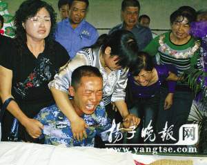 本報(揚子晚報)《為神圣一刻,父子生死等候54天》報道發(fā)出后,連日來在全國產(chǎn)生了很大反響,成千上萬的網(wǎng)友和讀者被袁亞萍的大義、堅強所深深感動,稱她為“偉大母親”。58天編織善意謊言,58天獨自忍受煎熬。昨天,母親袁亞萍終于等來了自己期盼的時刻——兒子王震在勝利完成首都國慶閱兵任務后,光榮返回家鄉(xiāng)大豐。在得知真相的那一刻,王震50多天來對父親無限的牽掛,瞬間化為無盡的哀痛。當他得知母親為了完成對自己承諾,將爸爸遺體從山東運回家鄉(xiāng)存放58天,并編織一個個謊言,就是為了讓自己順利完成受閱任務時,這位堅毅的軍人再也忍受不住內(nèi)心的悲痛,和媽媽抱頭痛哭……