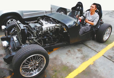 “半年前我一個(gè)好朋友興趣大發(fā),準(zhǔn)備自己造車,首先弄個(gè)車架、發(fā)動(dòng)機(jī)和手動(dòng)變速箱……”昨日,網(wǎng)名為“圣之夜 ”的網(wǎng)友在四川某汽車論壇上發(fā)帖稱,他的朋友制作了成都首輛DIY(自己動(dòng)手)漂移車。該網(wǎng)友上傳了一組反映該汽車組裝全過程的照片。此外,還有一段該車不久前在金港賽道上玩漂移的視頻。從照片中記者看到,這是一輛酷似老爺車的黑色敞篷車,汽車引擎、油箱、車座等全部裸露在外,車座是賽車椅子,車座兩旁沒有安裝車門,真可謂全敞篷。