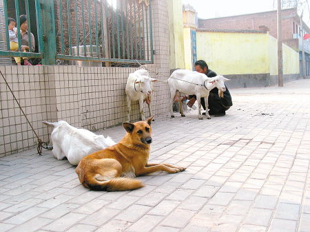 幾天前,記者在韋曲街道見到了老魏,老魏正忙著擠羊奶。老魏告訴記者,他養(yǎng)這4只奶山羊,“虎子”幫了大忙咧。老魏說的“虎子”其實(shí)就是臥在4只羊跟前的一條黃狗!斑@虎子今年才3歲,可真是羊的鐵桿保鏢!崩衔撼鲩T賣羊奶,他背個(gè)手在前面走,“虎子”領(lǐng)著羊兒跟在后面。到了下午,老魏到坡上放羊。他把“虎子”叫到羊跟前,吩咐一聲“把羊看好”后,便忙別的事!盎⒆印笨墒潜M職盡責(zé),一直守在羊跟前,生人要想靠近羊兒連門都沒有。天快黑了,老魏來到坡下,“回家咧!”一聲吆喝,“虎子”領(lǐng)著羊群順溜溜地下了坡!3年來,還沒丟過羊呢!崩衔赫f起虎子來贊不絕口。