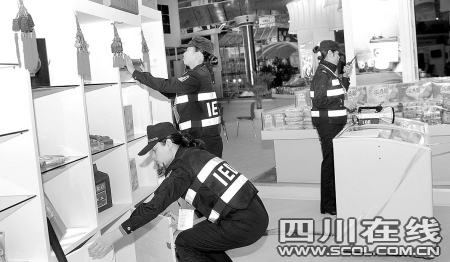 昨晚10點,新會展中心各展館里一片忙碌。在一群正在安檢的帥氣黑衣特警中間,3個扎著發(fā)髻的女特警格外引人注目。除負(fù)責(zé)現(xiàn)場指揮的教導(dǎo)員吳虹外,28歲的羅蕾正用伸縮臂鏡檢測著一食品展臺頭頂?shù)闹樱衲陝側(cè)刖闹苋,則彎腰在一排展柜前仔細(xì)檢查著。和男特警一樣,她們都穿著帥氣的黑色警服,戴著警帽,不施粉黛,右胸前印有“成都特警”4個大字的閃光背心,將她們襯得格外颯爽。