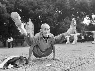 肖爹爹說,1982年離休后,身體每況愈下,還患上了肩周炎,便開始鍛煉身體。當(dāng)年播出《射雕英雄傳》后,他就迷上了變幻莫測(cè)的蛤蟆功,—練就是27年,身體也日漸結(jié)實(shí)。 記者周超攝