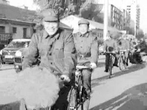 昨日上午,一支身穿綠軍裝、腳蹬二八自行車的迎親隊(duì)伍出現(xiàn)在街頭,立刻賺足了路人的“眼球”。