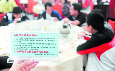 “看到桌上的提示牌都不好意思喝酒了,醉酒后還要讓工作繁忙的交警來代駕,多對不住人啊!弊蛉罩形,在位于開福區(qū)營盤路的天福家菜館用餐的李雄昂說。記者發(fā)現(xiàn),這里每張餐桌上都放著一張?zhí)崾九疲骸榜{駛員朋友:如您飲酒得不到家人朋友的理解不幫您代駕,那么請您打我的電話:13975155666。我們交警將為您提供免費(fèi)代駕服務(wù)。開福區(qū)交警大隊(duì)二中隊(duì)中隊(duì)長李樂!
