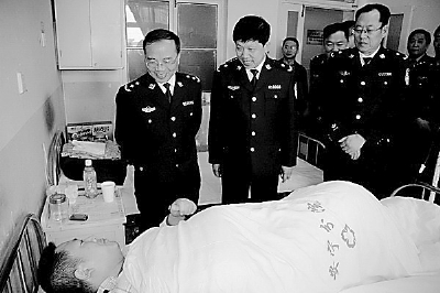 10月16日,省公安廳副廳長(zhǎng)、市公安局局長(zhǎng)王幸等領(lǐng)導(dǎo)專(zhuān)程趕往醫(yī)院,親切看望和慰問(wèn)了在抓捕毒販中英勇負(fù)傷的禁毒大隊(duì)大隊(duì)長(zhǎng)徐光明。在病房,王幸對(duì)徐光明、李剛、劉紅生、王麗萍4名民警的行為給予贊揚(yáng),并囑咐他們好好養(yǎng)傷,爭(zhēng)取早日康復(fù)。