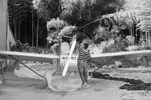 昨天是張全清的飛機首次試飛。經過反復調試后,他跳上飛機發(fā)動。