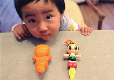 據(jù)楊女士介紹,上周末,她帶著2歲的女兒家奕到農(nóng)村去采摘,“孩子牙還沒長齊,正好喂軟柿子吃”。在柿農(nóng)為其采摘時(shí),家奕在一旁往樹上看,“她用手指著,嘴里嘟囔著什么。”這個(gè)柿子被摘下來,柿農(nóng)說它像人參果,就把它送給了家奕!盎貋淼穆飞,家奕就一直在玩那個(gè)柿子,嘴里還是嘟囔著。”回到家,家奕拿出“鐵臂阿童木”的玩偶,楊女士才知道,原來,家奕一直在說那個(gè)柿子像“阿童木”。楊女士說,“這個(gè)‘柿子阿童木’都已經(jīng)軟了,但是,如果放進(jìn)冰箱凍起來,家奕玩不到就會(huì)哭的! (實(shí)習(xí)記者李川)