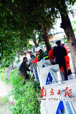 昨天(4日)上午,廣州體育學(xué)院一名學(xué)生抓到一名偷電腦的小偷,不料小偷在被押往警務(wù)室的途中,掙脫保安跳入沙河涌并躲進(jìn)排污口兩個(gè)多小時(shí)。據(jù)抓獲小偷的保安介紹,小偷跳入河中后,路過的同學(xué)見了,紛紛拿東西砸向小偷,小偷叫囂道:“再砸就把你們宿舍偷光!”
