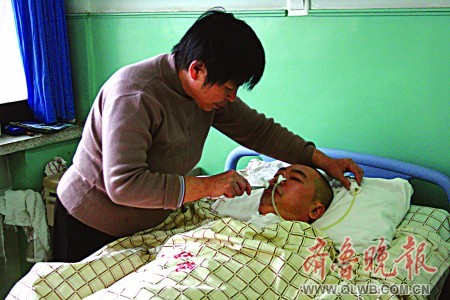 11月3日,平陰縣人民醫(yī)院神經(jīng)內(nèi)科病房內(nèi),李傳華靜靜地躺著,一動不動。他就是黃文芝的丈夫,近六年前病倒在工作崗位上的一名警察。他成為植物人快六年了,黃文芝在病床左右守候了近六年。