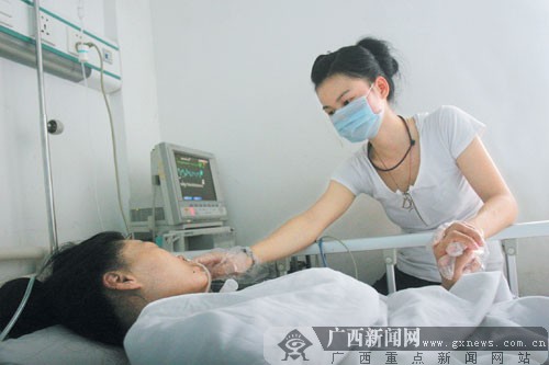 11月8日中午,記者根據(jù)帖子上所留的手機號碼聯(lián)系上了楊霏。“姐姐,你睜開眼睛看看我啊,睜大一點,乖,就是這樣!”當(dāng)天12時30分,在廣西醫(yī)科大一附院神經(jīng)內(nèi)科一病區(qū)7樓的病房,楊霏和剛進(jìn)食完的姐姐在說話。楊霏的大姐楊耀仙躺在病床上,鼻口插著氧氣管,整個身體干瘦得只剩下皮包骨頭,神志也是迷糊不清。楊耀仙現(xiàn)在不能自行進(jìn)食,只能靠親人從連接在身體上的幾條塑料管注射一些醫(yī)院配制的流體食物維持生命。而楊霏也不時拿起姐姐的手和腳做一些物理按摩。“我姐姐這兩天病情有所變重了!币姷接浾,她給姐姐蓋好被子,示意到樓梯口說話。