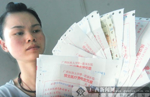 楊霏身高約160厘米,脫去口罩,端正的五官和瓜子型的臉?biāo)鶚?gòu)建出來的一張清秀的臉龐出現(xiàn)在記者眼前。一頭烏黑的長發(fā),額頭前的劉海也難以掩蓋略顯蒼白的臉色!艾F(xiàn)在醫(yī)生都不肯定我姐姐的病能否醫(yī)治好,但我們都沒有放棄!睏铞煅实卣f,9月6日,大姐楊耀仙突然感覺身體不舒服住進(jìn)了廣西醫(yī)科大一附院西院,入院后她都不愿意吃東西,不久便昏迷了。9月11日,被檢查診斷為淋巴性結(jié)核。當(dāng)天下午又做了一次腰椎穿刺檢查,發(fā)現(xiàn)姐姐還同時患上了結(jié)膜性腦膜炎。晚上8時,大姐病情突然加重,心臟曾一度停止跳動。幸好,經(jīng)過醫(yī)生搶救,終于蘇醒過來。之后,便在ICU病房內(nèi)一直觀察到9月29日才回到普通病房。隨后,她被轉(zhuǎn)到醫(yī)科大一附院救治,醫(yī)院確診她患的是結(jié)核性多重疾病。