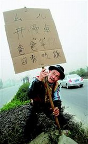 往常,這個狹小的路口并未引起過往駕駛員的注意。昨日,當(dāng)兩塊相同的雷人交通警示牌立于道路中央隔離欄后,引起了部分駕駛員關(guān)注。警示牌是分別用兩塊約1平方米的紙板做的,上面用毛筆彎彎曲曲地寫著:“幺兒,開慢點,爸爸等你回家吃飯!”