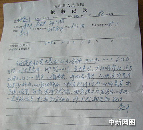 記者在南和縣人民醫(yī)院見到陳雪川的“搶救記錄”,記錄顯示:主因突發(fā)性意識喪失約30分鐘,于2009年11月2日6時05分入院,入院查體,意識喪失,大動脈搏動消失,雙瞳孔約5mm,固定,心音消失,呼吸音消失,心電圖為直線,初步診斷為心源性猝死,入院后給予綜合搶救,電復率4次后患者心跳一直未能恢復,搶救30分鐘后,終因搶救無效,死亡。