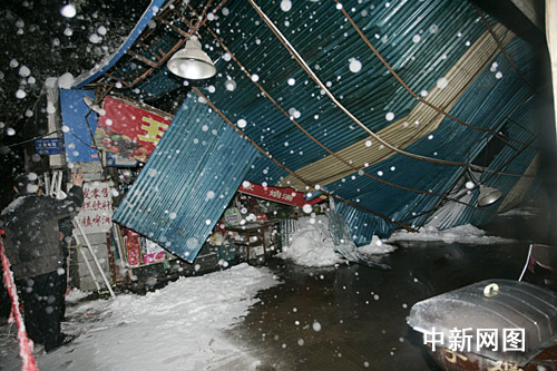 中新網(wǎng)石家莊11月10日電(李光)今天下午,河北省石家莊市槐中路新世隆商場(chǎng)附近一自由市場(chǎng)由于頂蓬積雪過多被壓塌。