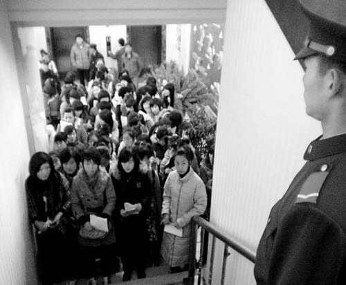 當記者進入鴻翔賓館一樓大廳時,前來報名的女孩和家長們將這里擠得水泄不通。在賓館二樓,沈陽警備區(qū)的工作人員正在做著準備工作!皥竺_始后,我們將進行分類,在校大學生將走一個門報名,應屆畢業(yè)生將走另一個門。”