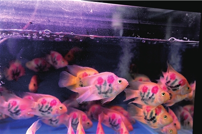 記者走訪了位于高碑店附近的幾個水族區(qū),發(fā)現(xiàn)都有這種文身魚出售。這種魚有成人手掌大小,魚身上刻有玫瑰花和各種寓意發(fā)財(cái)吉祥的圖案。文身魚主要有兩個品種,一種叫“鸚鵡”的紅黃色熱帶魚,另一種是有著兩條長長胡須的白色“招財(cái)魚”。