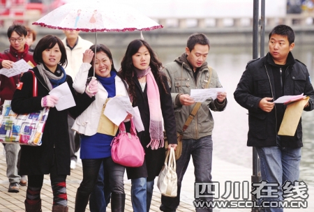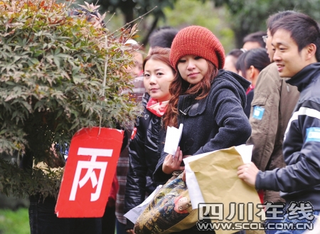 “喝著鹽水聊天!喝著鹽水聊天!有沒有人接暗號。俊薄罢f話凈閑(咸)扯!終于找到你們了!弊蛉障挛3點,成都高新區(qū)大型公益單身青年聯誼會在有趣的拓展訓練中拉開帷幕。盡管是周末,但高新區(qū)孵化園露天中心廣場卻人頭攢動,好不熱鬧。三人一組的單身白領冒著冬雨,頂著寒風,站在現代化的樓宇間,口里齊聲喊著一些奇怪的詞組。原來,現場趕來的600多名單身青年們隨機分成了若干小組,正在參加moving&meeting(找朋友)的拓展游戲。通過地圖找到指定地點,喊著接頭暗號,兩個陌生的小組重新組成一個大組,然后進行新一moving&meeting(找朋友)游戲。最終8個三人小組組成了一個團隊,原本陌生的24個人在游戲中相互認識、一起完成游戲任務。隨即,團隊間進行了“幸福團團轉”、“迎接新娘”等趣味游戲。