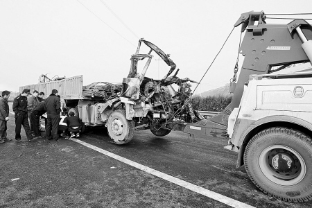 昨天下午,記者趕到西禹高速時(shí),省公安廳交警總隊(duì)高交支隊(duì)的民警正在指揮清障車拖拉車號(hào)為陜E2679的一輛半掛貨車。這輛滿拉著鋼材的半掛貨車,駕駛室受撞擠壓成扁平狀,已被燒成黑色。如果不是右側(cè)車身伸出扭曲的車門,幾乎無法讓人判斷出這里就是車頭。省交警總隊(duì)高交支隊(duì)一大隊(duì)事故科科長(zhǎng)楊大偉介紹,這輛車的司機(jī)和副駕駛座上的人均已當(dāng)場(chǎng)死亡。