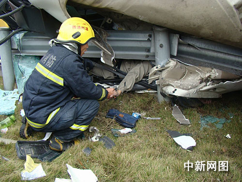 接警后,30多名消防救援人員迅速趕赴現(xiàn)場。10時(shí)13分許,救援人員趕到事故現(xiàn)場。一輛車牌為閩A25785的加長大貨車撞斷高速護(hù)欄后,側(cè)翻在路邊,車頭已經(jīng)面目全非,車體嚴(yán)重扭曲變形,從車身外部清楚可見變形駕駛室與地面之間有一名男子被死死卡住,動彈不得,臉色蒼白,另一名人員被卡在駕駛室內(nèi),生死不明,情況十分緊急。而且側(cè)翻導(dǎo)致油箱破裂,油箱里的柴油已經(jīng)流了一地,情況十分緊急,急需救援。