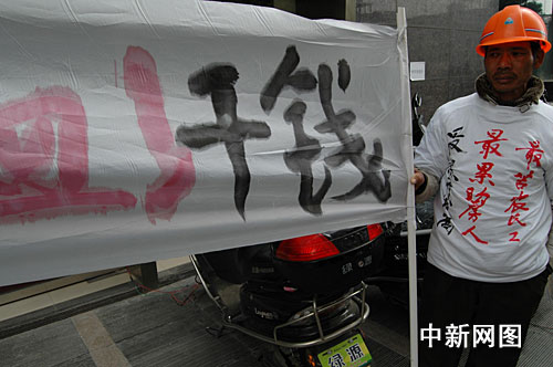 中新網(wǎng)貴港12月16日電 (記者 王剛)16日早,廣西貴港市數(shù)十農(nóng)民工爬上該市市區(qū)最高樓盤“聯(lián)邦國際”欲跳樓討薪,情緒激動的民工還掛出“最苦農(nóng)民工、最累購房人、最黑開發(fā)商”、“還我血汗錢”等橫幅聲討開發(fā)商。