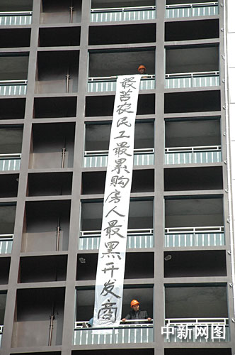記者11時許在現(xiàn)場看到,30多層的“聯(lián)邦國際”二期樓盤已被掛上多條白底黑字的橫幅,內(nèi)容以聲討開發(fā)商為主,其中最顯眼的是“討薪討薪步履艱辛”、“最苦農(nóng)民工最累購房人最黑開發(fā)商”。 10至20層的多個窗臺上,頭戴安全帽的民工們不時高呼“黑心開發(fā)商,還我工錢”、“我要回家”等口號,樓下圍聚的數(shù)十男女民工也齊聲附和高喊。此時,有兩名女子一邊走進(jìn)聯(lián)邦國際大樓一邊指指點(diǎn)點(diǎn)說:“有本事就跳下來,最好一了百了!