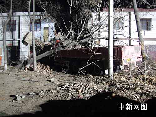 今日凌晨2時06分,河南新鄭消防部門接報后,救援人員立即趕赴現(xiàn)場,只見一輛大貨車已經(jīng)深深扎入一棟掛著汽車修理店門牌的二層樓房內(nèi),樓前一棵直徑約60公分的大樹被撞斷,大樹的樹身偏移樹根約有五、六米遠(yuǎn),正壓在貨車的車身上。此時的修理店已經(jīng)坍塌了一大半,大量的水泥樓板、磚頭覆蓋了貨車的車頭。