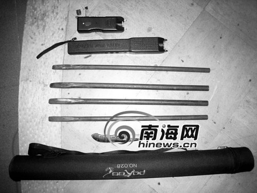 “你隨身攜帶的電棍做什么用的?還自制開鎖器?” 記者在瓊?词厮姷皆谘旱暮沃铱。何說,電棍有電擊功能又有照明功能,攜帶電棍用來防身,如果被人發(fā)現(xiàn),他們便用電棍電擊他人,同時(shí)在作案時(shí)用來照明。