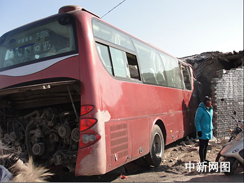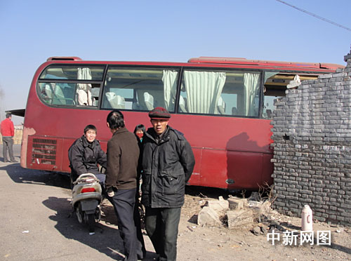 據(jù)現(xiàn)場目擊者稱,大客車是與當(dāng)?shù)厮痉ú块T的小型轎車發(fā)生碰撞后,由于車速較快,大客車猛然沖進公路旁的民房內(nèi),所幸屋內(nèi)沒人,民房被撞一角嚴(yán)重受損,墻體坍塌。