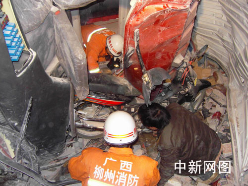 柳州鹿寨消防中隊(duì)接警后,立即出動(dòng)一輛搶險(xiǎn)救援車和6名官兵趕往事故現(xiàn)場(chǎng)。在現(xiàn)場(chǎng),已聚集了眾多民眾,公安、120醫(yī)護(hù)人員已經(jīng)到場(chǎng)。此時(shí)出事貨車車身已“霸占”了三個(gè)門面,車頭鉆入一修理店店鋪,地上散落著鐵礦和從屋頂?shù)袈涞氖尥摺?/p>