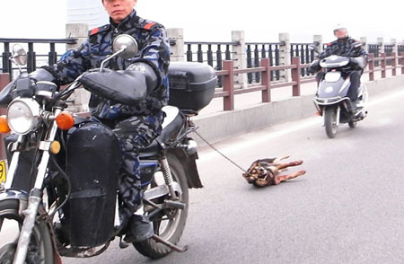 摩托車(chē)后系著一條鐵鏈,拖著一只血肉模糊的狗飛奔。昨天,一組被標(biāo)著“慘無(wú)人道”標(biāo)題的照片在福州各大論壇瘋傳,甚至被稱(chēng)為福州版的虐狗門(mén)。拍下這些照片的網(wǎng)友表示,在春節(jié)期間看到如此一幕非常難受,而有網(wǎng)友認(rèn)為這可能是有人在偷狗。