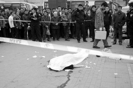 昨日11時(shí)40分許,鄭州市客運(yùn)南站門前。一身穿黑色棉襖、灰色短褲的年輕女子,躺在地上,臉上、脖子處遍布血跡。一旁,救護(hù)人員正對其救治,近百名市民議論紛紛。