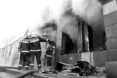7時許,記者在現(xiàn)場看到,一家經(jīng)營變頻器的門市房內(nèi)冒出滾滾濃煙,火借風(fēng)勢很快將樓上一家旅店引燃,消防人員正在二層破拆打水撲救,并迅速將屋內(nèi)的煤氣罐轉(zhuǎn)移,二層的近10扇窗戶玻璃被擊碎排煙。經(jīng)過兩個小時的救援,火勢被控制住。此時,門市房受損嚴(yán)重,室內(nèi)的物品被燒焦,窗戶玻璃破碎。人行道及車行道上的積水結(jié)了一層薄冰。