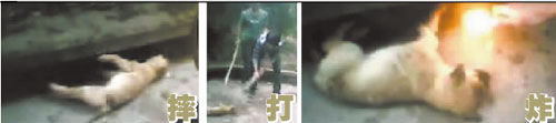 視頻不長,但實(shí)在令人揪心。被虐小狗是一條黃色小狗,從視頻一開始到結(jié)束都在承受地獄般的摧殘:身著橫條紋上衣的男生提著小狗用力摔下約2米高的階梯!八罌]?”“沒有,還在出氣。”“哈哈哈。打死,打死來吃。”小狗慘叫了兩聲,躺在地上不能動彈,從拉近的視頻鏡頭可以看到,它在急促地呼吸!坝没鹋谡ㄋ 碑嬅嫱,一個男生的聲音尖叫道。緊接著,“橫條紋”將幾個鞭炮塞進(jìn)小狗嘴里,用打火機(jī)點(diǎn)燃后跑開!鞍、叭、叭”三聲清脆的鞭炮相繼響起,視頻中同時傳出了幾個男生瘋狂的笑聲。